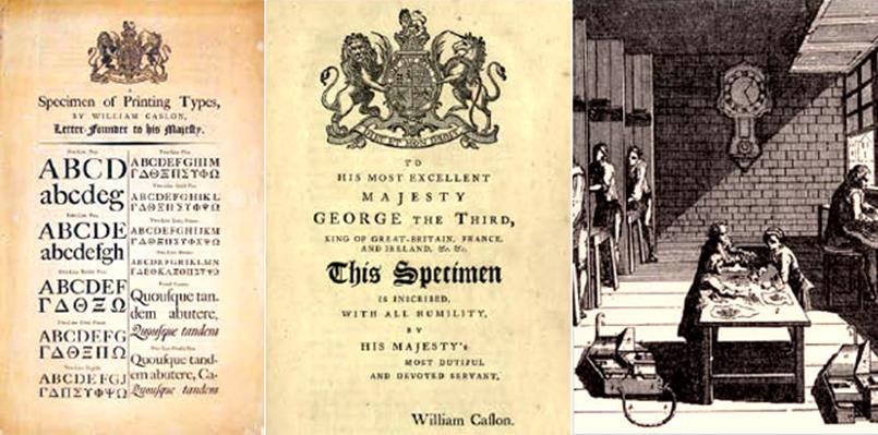 ▲ Caslon체의 서체 견본과 Chiswell Street에 있던 활자공방의 내부 모습