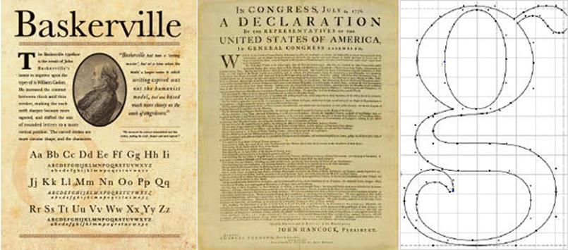 ▲ Baskerville체의 서체 견본과 미국독립선언문, 그리고 글꼴의 작도법