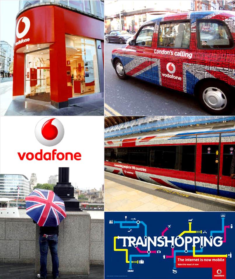 ▲ 위의 사진들은 최근 런던 시내에서 흔히 볼 수 있는 광고물 중에 이동통신 서비스회사인 Vodafone의 지점과 택시와 전철 등 교통수단에 적용된 그래픽(영국 국기와 타이포그래피를 잘 활용한 광고)과 로고이다. 우측하단의 사진은 BBH London 광고 대행사가 제작한 모바일 인터넷 서비스를 알리는 광고물로 유명한 런던 서브웨이 노선도의 시각적 특성을 연상시키는 컨셉이다.