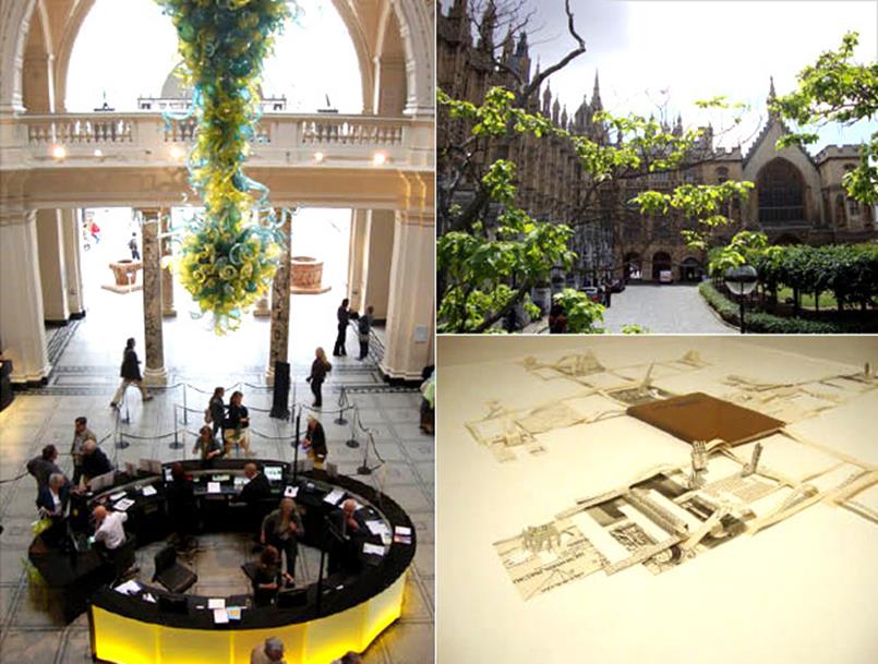 ▲ Victorian & Albert Museum 내부 전경 고전과 현대의 조화가 돋보이는 박물관으로 다방면에 흥미로운 특별 전시가 매월 기획된다. 우측 하단의 사진은 건축관련 전시에 디스플레이 되었던 다이컷으로 구성된 건축 서적이다. 흥미로운 것은 기존의 pop up book이 갖고 있는 도형의 입체화에 그치지 않고 타이포그래피와 각 펼침 페이지, 그리고 건축물 드로잉이 한데 어울려서 마치 거대한 도심의 파노라마 모형도를 연상시킨다는 것이다.