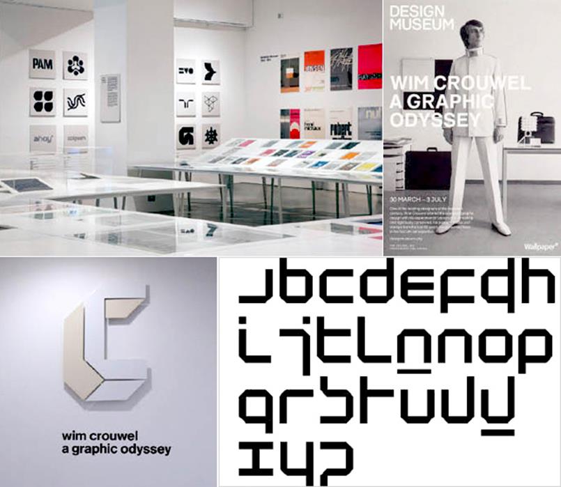 ▲ 네덜란드를 대표하는 타이포그래퍼이자 그래픽 디자이너인 Wim Crouwel의 작품을 총망라한 대형 전시 “a graphic odyssey”가 지난 6월 런던 여행 중 London design museum에서 있었다. 윗줄의 사진은 전시장 내부 전경과 포스터이다. 아래는 그의 디자인 스타일과 철학을 잘 드러내는 전시 엠블렘이며 우측은 이른바, new typography로 명명된 미래주의적 서체 구조를 가진 그의 유명한 디자인이다. 이 작품은 후에 세계 각국의 디자이너들에게 엄청난 영향을 주었고 우리나라에서도 그 영향을 받은 글꼴들이 만들어졌다.