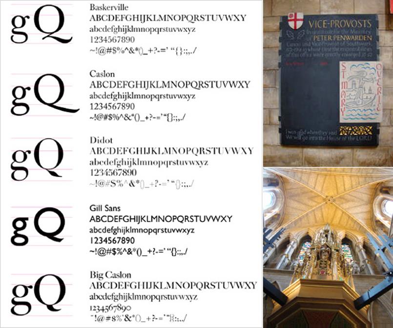 ▲ 좌측의 위로부터 Baskerville, Caslon, Didot, Gill Sans, 그리고 Matthew Carter가 리디자인 한 Big Caslon 서체이다. 획과 카운터 스페이스 그리고 중심축의 각도가 변화되어온 이른바 과도기적 현상을 살펴볼 수 있다. 오른쪽 사진은 런던 시내 한 성당에서 흔히 볼 수 있는 서체와 애플리케이션이다.