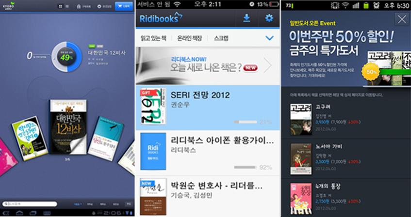 이에 반해, 국내는 2004년 전자책이 정식 출판물로 등록되기 시작했고, 2011년 기준으로 전자책은 국내 출판시장의 2%를 점유하는데 그쳤다. 미국과 비교해볼 때 국내 전체 책 시장에서 전자책이 차지하는 비중은 아직 미비한 것이 사실이다. 그러나 그 잠재적인 성장세만큼은 눈 여겨볼만하다는 것이 업계 전망이다. 스마트폰과 스마트패드, 전용 전자책 리더기 등 e-Book을 소비할 수 있는 디바이스의 높은 보급률 증가와 더불어 출판사, 유통사(교보문고, 인터파크, 네이버 등), 통신사(SK, KT 등)의 적극적인 사업모델 확장에 힘입어 국내 전자책 시장은 전년대비 50% 이상의 성장세를 이어가고 있다. 올해 예상치는 3,250억 원 이상이라는 것이 업계 전망이다. 하루가 다르게 급변하는 IT 물결을 파도 삼아 국내 전자책 시장도 비로소 대중화 물결을 타기 시작했다고 말해도 큰 무리는 없다.