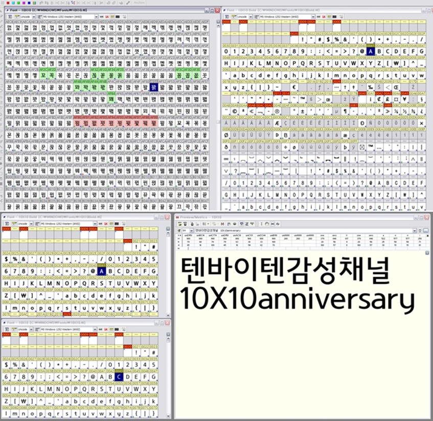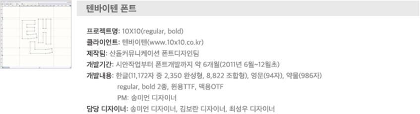 텐바이텐 폰트 제작 프로젝트는 창립 10주년을 맞은 텐바이텐(www.10×10.co.kr)이 지난 2011년 10월 10일, 열 번째 생일을 맞아 고객에게 즐거움과 새로움을 주고 신뢰 받는 기업 목표를 기반으로 그 동안 받은 사랑을 보답하기 위해 개발된 무료 폰트이다. 텐바이텐과 산돌커뮤니케이션이 MOU를 맺고 오랜 연구 끝에 완성한 10X10 폰트는 필순을 고려한 자연스러운 고딕 스타일에 라운딩을 배제한 중성적인 느낌을 담아 디자인되었다. 곧은 초성과 적절한 공간 분배로 시원하게 디자인해 탈네모꼴의 새로운 서체 스타일을 선보이고자 했다.