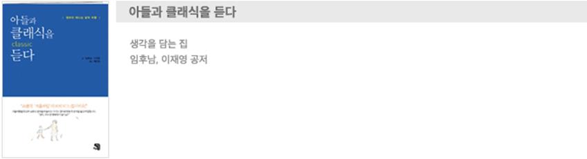 많은 사람들이 첫인상, 잠깐의 만남으로 무언가를 판단하는 것은 경솔한 일이라고 말한다. 좋지 않은 첫인상으로 잘 알지도 못하고 부정적으로 판단해버리는 것은 물론 경솔한 일이다. 하지만 잘 모르지만 왠지 긍정적인 에너지를 느꼈다면 그 느낌을 믿고 신뢰를 보내는 것은 좋다고 생각한다. 서점에서 만난 임후남 작가에게서 강한 긍정의 에너지가 느껴졌고 그 기운 덕분에 책에 관심을 갖게 되었다. 그 결과 아이에게 소개해주려 했던 친구 ‘클래식 음악’이 내 친구가 되었다. 좀 더 사귀어서 아들에게도 소개해줄 생각이다.