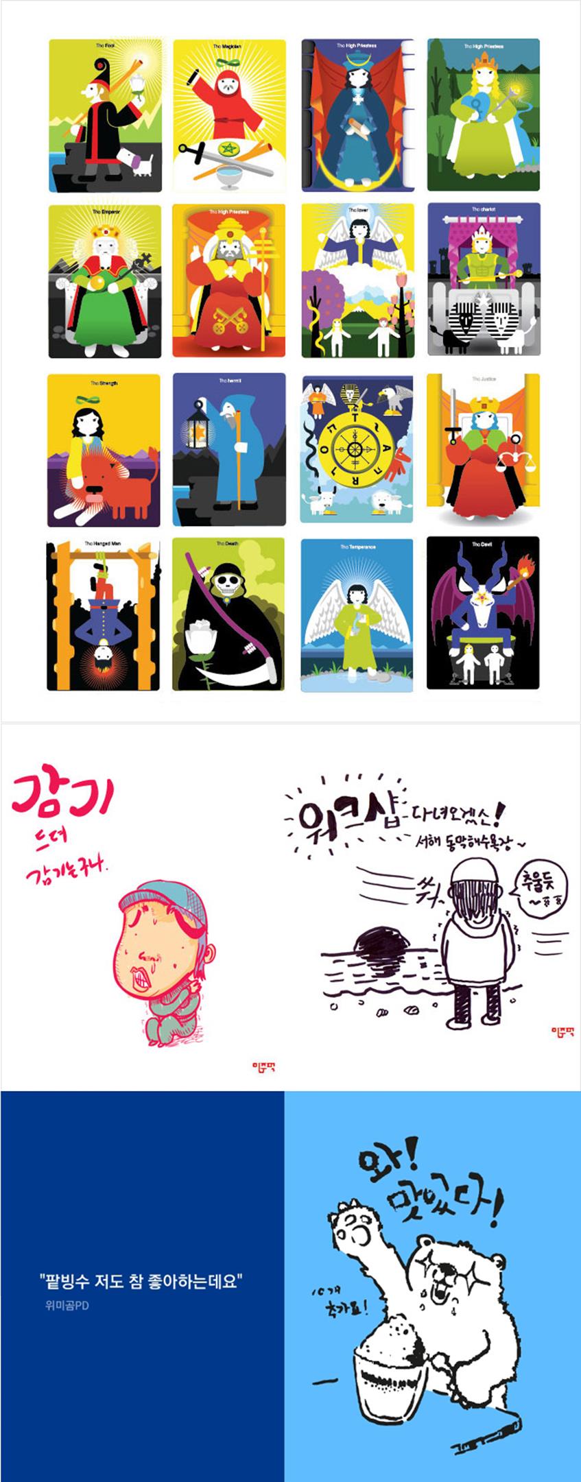 (위에서부터) 직접 일러스트를 작업해 참여한 타로카드 앱 프로젝트, 하루 일을 그림으로 그려 매일 블로그에 올렸던 그림, 카페 위미에서 판매하는 팥빙수를 소개하기 위해 제작한 PT자료.
