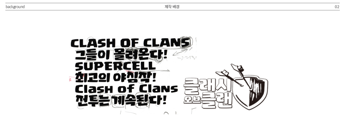 재치있는 광고나 그래픽으로 잘 알려진 ‘클래시 오브 클랜’은, 브랜딩을 위해 영문전용서체를 개발하여 효과적으로 사용하고 있었다. 다만, 한글 전용서체는 따로 가지고 있지 않아 게임에서