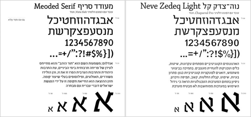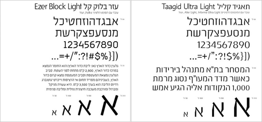 히브리어 폰트를 디자인 할 때 몇 가지 방법을 가지고 진행합니다. 첫 번째는 히브리어가 쓰인 역사적 문헌 속에서 힌트를 얻는 것입니다. 오래된 책이나 캘리그래피에서 발견한 미(美)를 현대적 폰트 시스템으로 옮기는 방법입니다. 두 번째는 라틴 폰트에서 도움을 받는 것입니다. 예를 들면 헬베티카를 기본으로 비슷한 형태의 히브리어 버전을 만드는 방법입니다. 세 번째 방법은 자연이나 과학, 건축 등 조금은 거리가 있는 분야에서 흥미로운 무언가를 찾아 적용하는 것입니다.